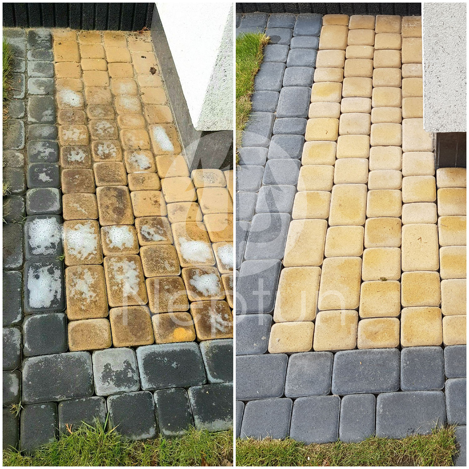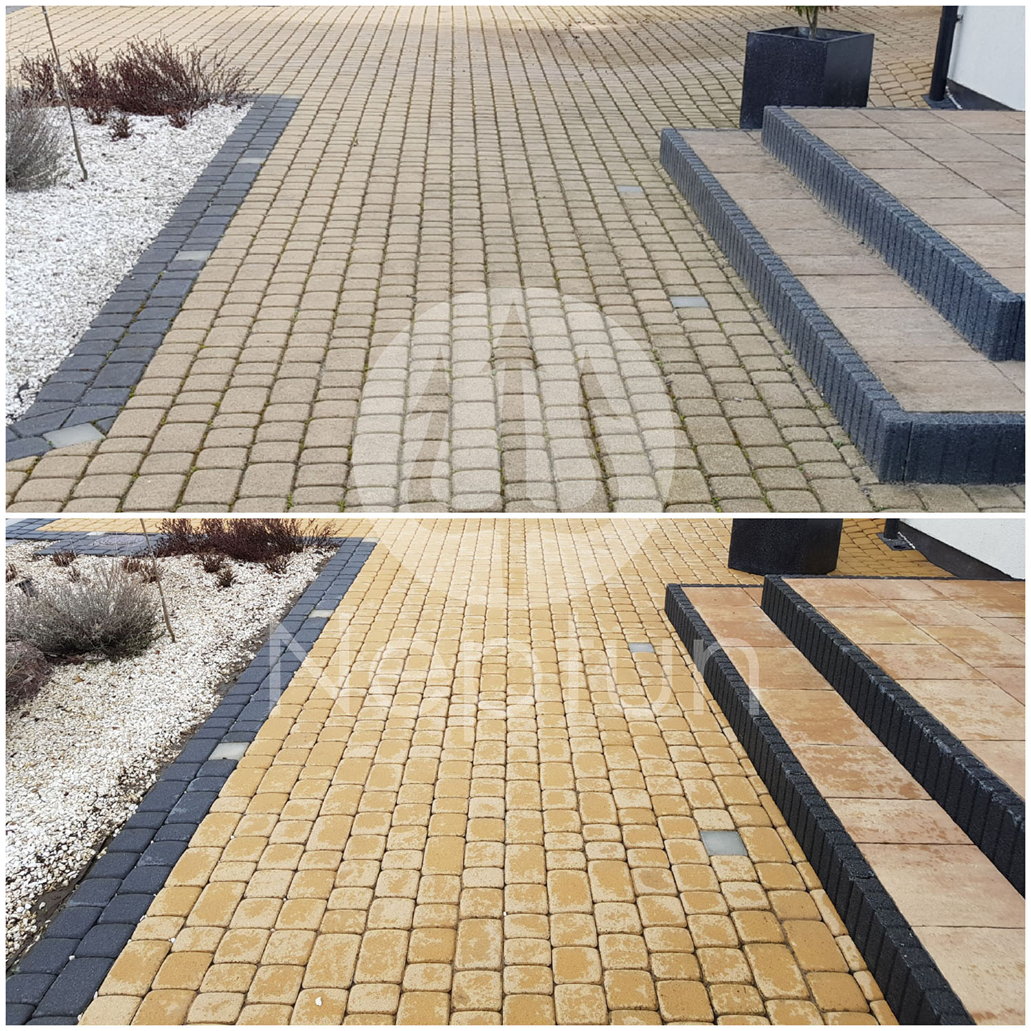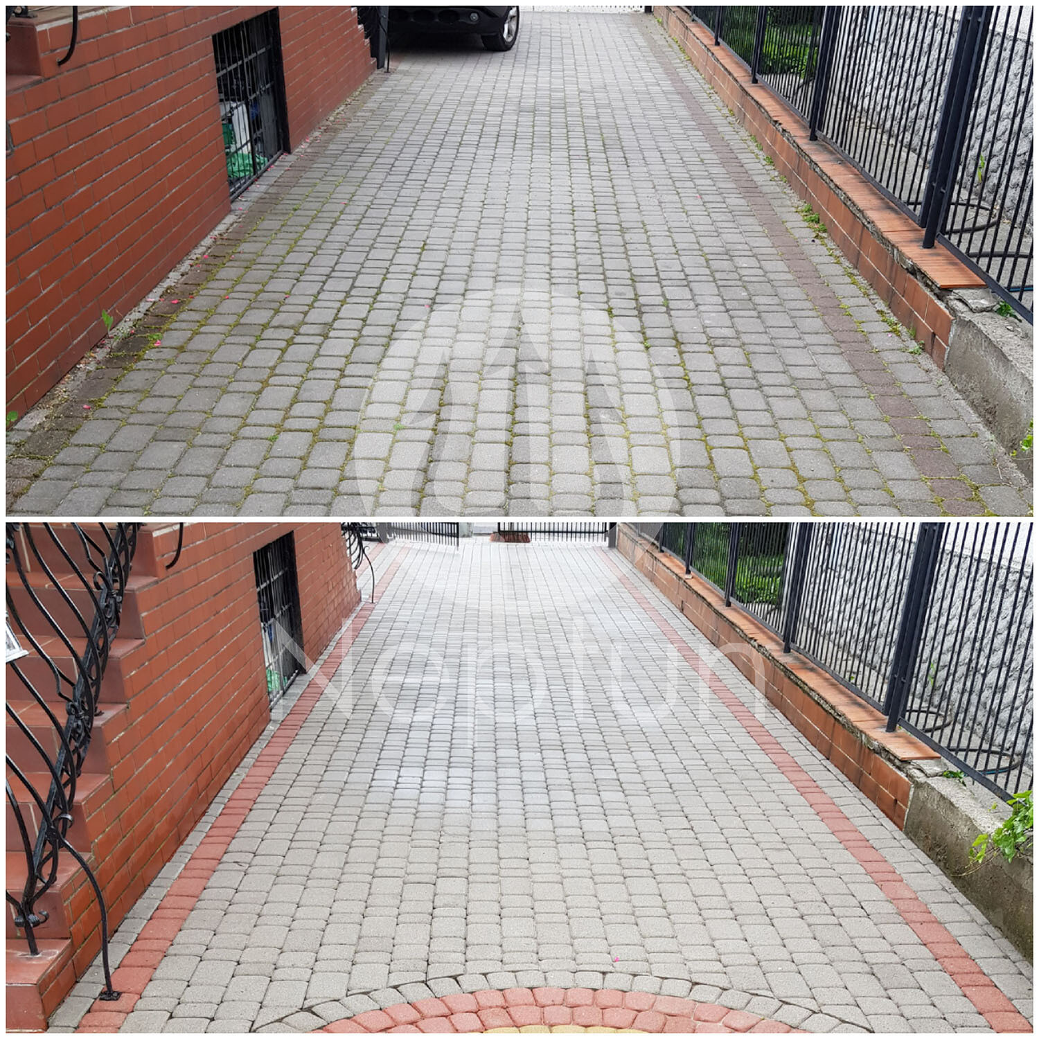 Mycie kostki brukowej wraz z impregnacją mikrobiologiczną.