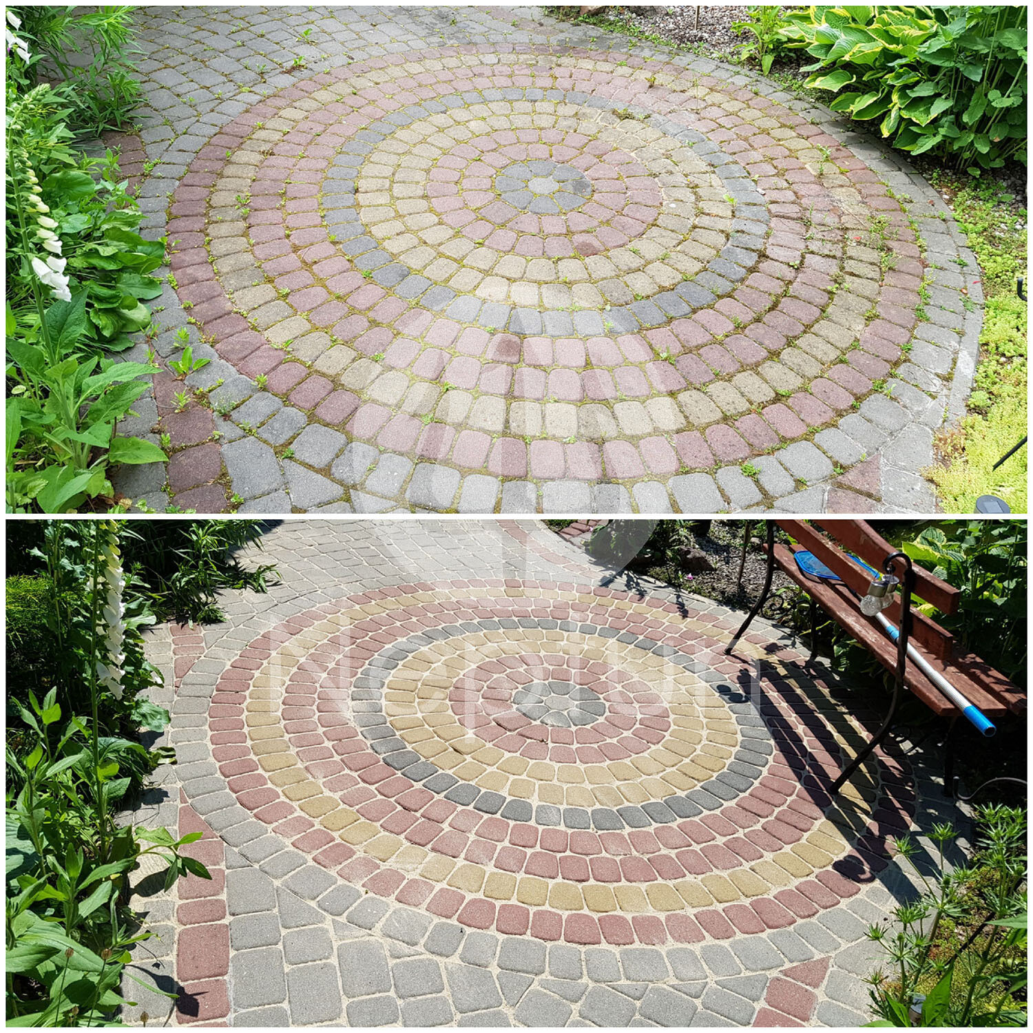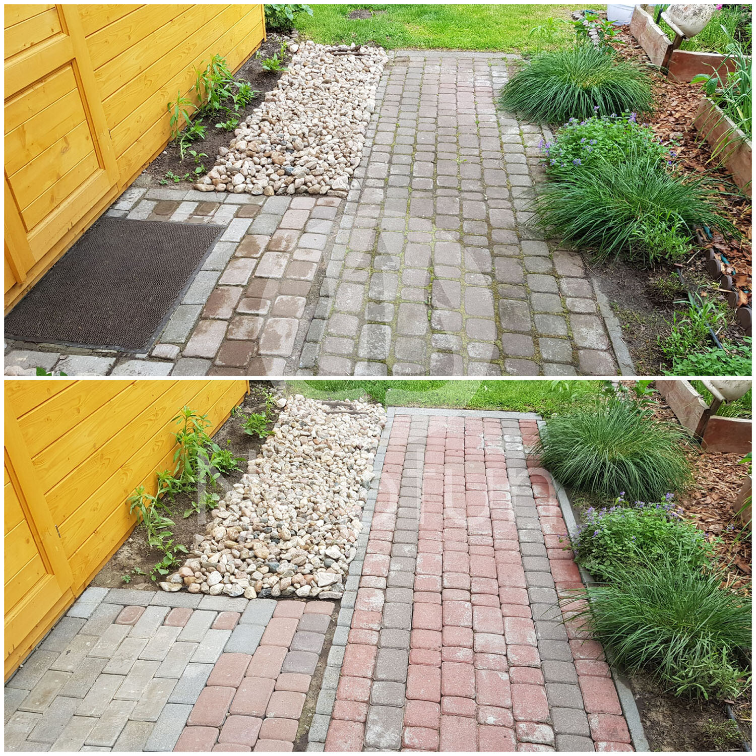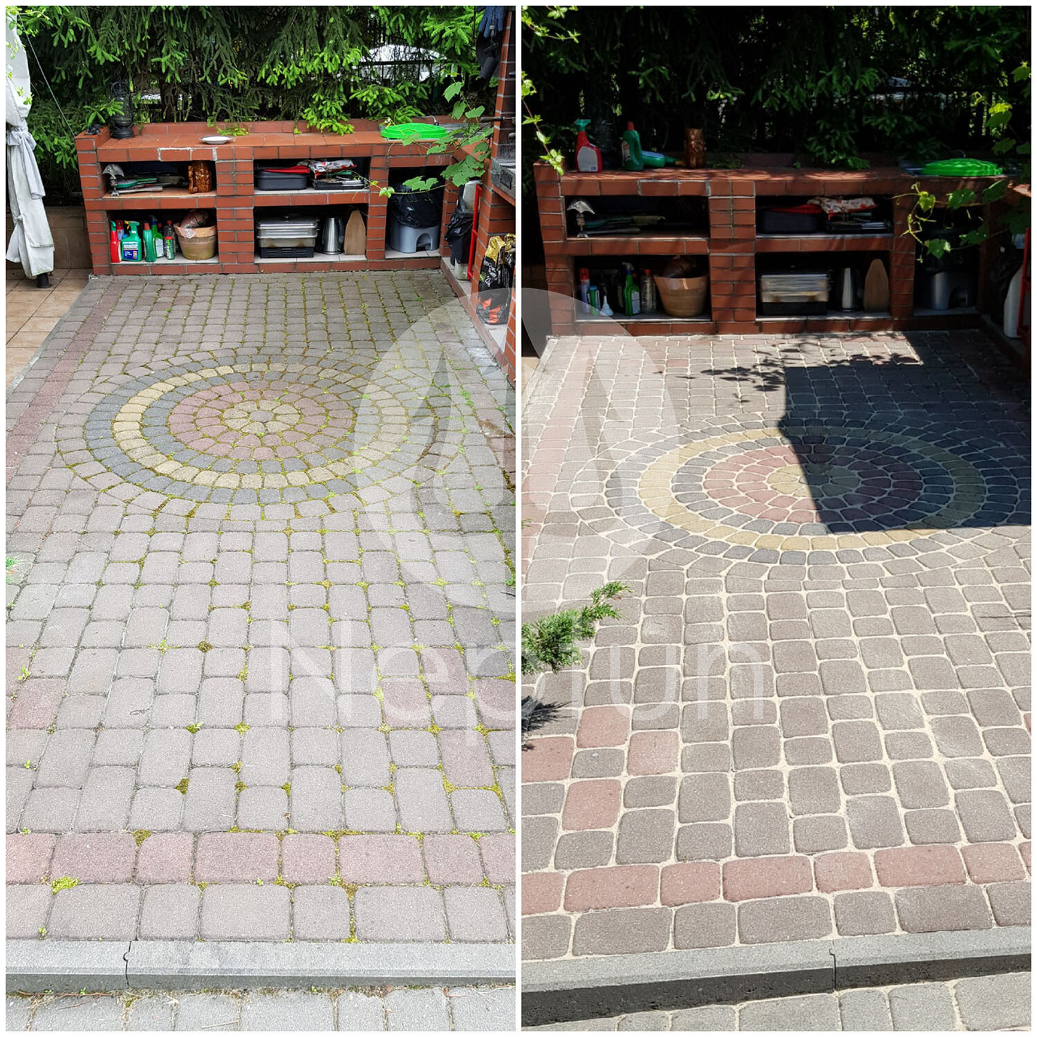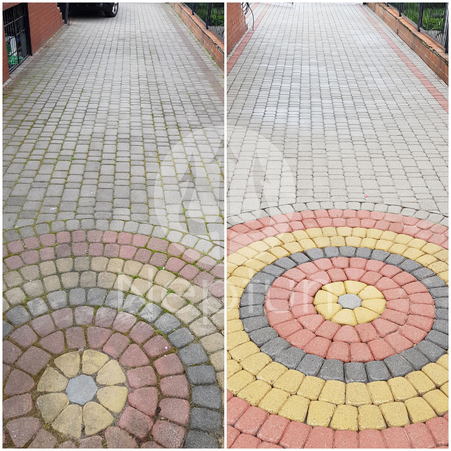 Mycie kostki brukowej wraz z impregnacją mikrobiologiczną oraz spoinowaniem piaskiem.